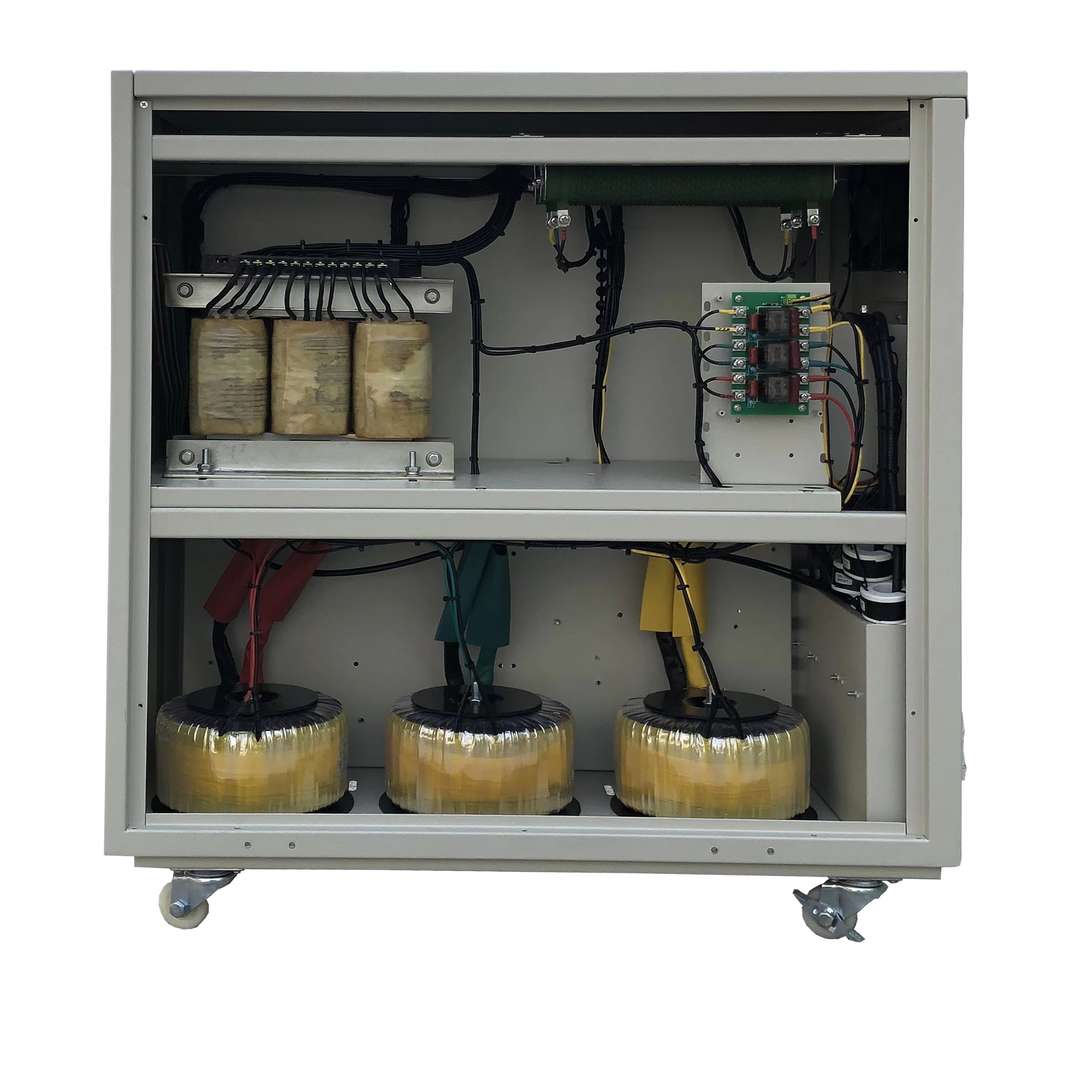 無觸點(diǎn)電子式交流穩(wěn)壓電源相關(guān)性能簡介: ★可靠性高,穩(wěn)定性好,能長期連續(xù)使用。 ★采用PWM技術(shù),響應(yīng)時(shí)間短60 mS -100mS。 ★可適用于任何負(fù)載:阻性,容性,感性。 ★負(fù)載性能好,能適應(yīng)各類負(fù)載,并能承受短時(shí)過載。 ★保護(hù)功能齊全:過/欠壓、錯(cuò)缺相、過流、過載保護(hù)。 ★穩(wěn)壓范圍寬,抗干擾能力強(qiáng), 輸出精度高。 ★操作方便,無需手調(diào),內(nèi)部全電子控制無觸點(diǎn)調(diào)壓,永無磨損。 ★無需人員值守,無需特別維護(hù)。 輸入電壓 三相(320-440)V 波形失真 ≤0.5% 輸出電壓 三相(380)V, 抗電強(qiáng)度 1500V/60S<10mA 穩(wěn)壓精度 ±1% 絕緣電阻 >5MΩ 響應(yīng)時(shí)間 60-100(ms) 環(huán)景溫度 -10℃—+40℃ 功率因數(shù) ≥0.7 噪 音 ≤50dB 工作頻率 50/60HZ 相對濕度 <85% 大功率補(bǔ)償式交流穩(wěn)壓電源相關(guān)性能簡介: ★容量大、效率高、能長期連續(xù)使用。 ★可適用于任何負(fù)載:阻性,容性,感性。 ★負(fù)載性能好,能適應(yīng)各類負(fù)載,并能承受短時(shí)過載。 ★穩(wěn)壓范圍寬,輸出精度高。 ★操作方便,特設(shè)手動和自動選擇調(diào)壓方式。 ★制造成本底,初期投入小。 輸入電壓 三相(310-450)V 波形失真 不產(chǎn)生波形畸變 輸出電壓 三相(380)V, 抗電強(qiáng)度 1500V/60S<10mA 穩(wěn)壓精度 ±(2-5%)可設(shè)定 絕緣電阻 >5MΩ 響應(yīng)時(shí)間 ≤0.5S 環(huán)景溫度 -10℃—+40℃ 功率因數(shù) ≥0.8 噪 音 ≤50dB 工作頻率 50/60HZ 相對濕度 <85%